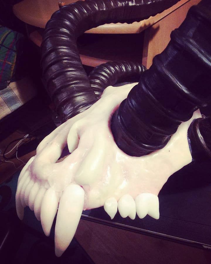 This skull is a head piece, and was made for my very first original character armor, from scratch. The base is polyfoam, coated with polymorph and maxed out with four paper mache horns. Love to do props!
