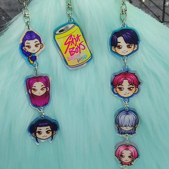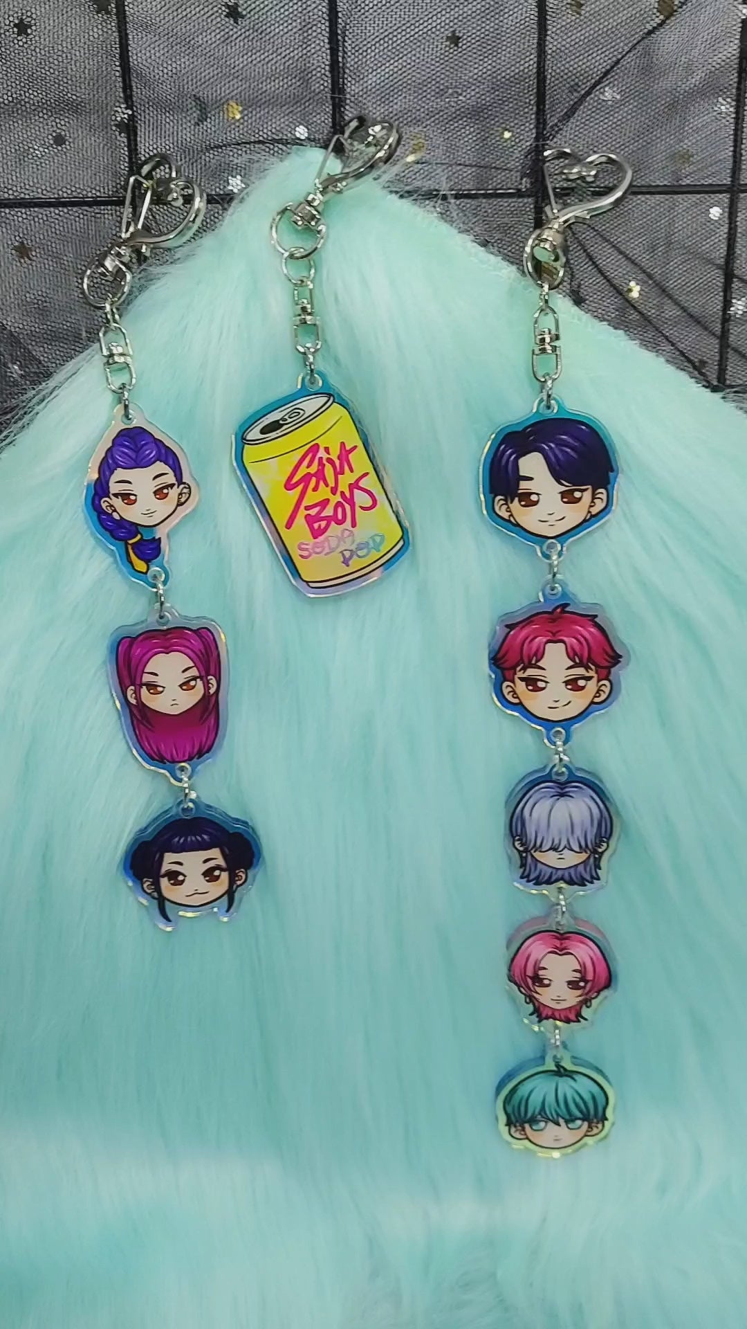 Kpop Demon Hunters inspired long acrylic keychain featuring connected acrylic pieces in a chain-style design, finished with a heart-shaped clasp. This eye-catching keychain has a subtle holographic effect that catches the light beautifully, making it a perfect accessory for bags, backpacks or keys. The acrylic pieces are made from 3 mm thick, high-quality acrylic, with the artwork printed inside the acrylic, rather than on the surface. This means the design is scratch-proof, durable and long-lasting, even with everyday use. Each keychain is lightweight yet sturdy, designed to move naturally with the chain structure while keeping its shape. A great choice for fans of K-pop inspired designs, alternative accessories, or unique artist-made merch.